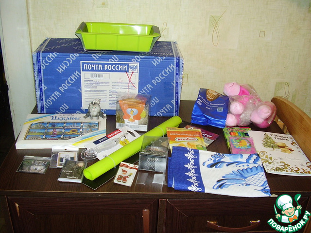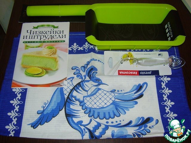 Полотенце с Синей птицей, очень познавательная и интересная книжка (уже присмотрела оттуда рецептики), силиконовые коврик и форма и мерные ложечки.