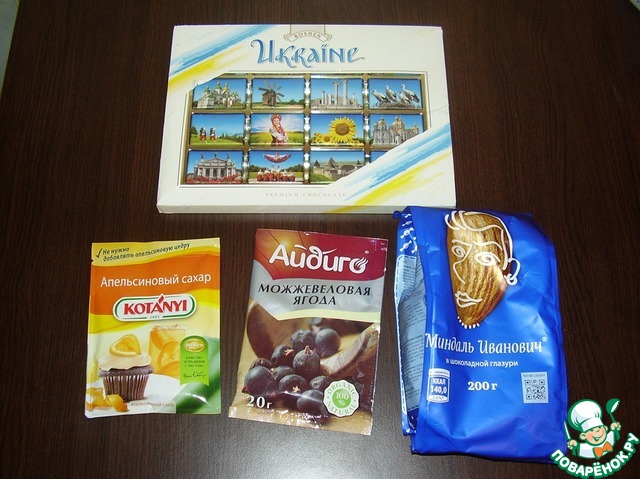 Исключительно красивый набор шоколадок (наверняка и вкусный, но есть их жалко), вкусный-вкусный миндаль в шоколаде, апельсиновый сахар (аромат от него - настоящий апельсин) и можжевеловые ягоды! Я давно хотела попробовать можжевельник, но никак не могла купить - только молотый, в смесях. А теперь у меня на новогодних каникулах будет настоящая рождественская запеченная свинина, с можжевельником.