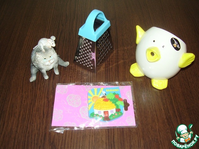 Забавный котик с мышкой на голове, цыпленок - разделить желтка и белка, милая терочка и еще раз магнитик. При виде цыпленка муж окончательно расчувствовался и сказал срочно идти говорить "спасибо"