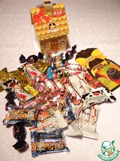Это съедобная часть- очень вкусные конфеты, листовой желатин и красивый домик с чаем.