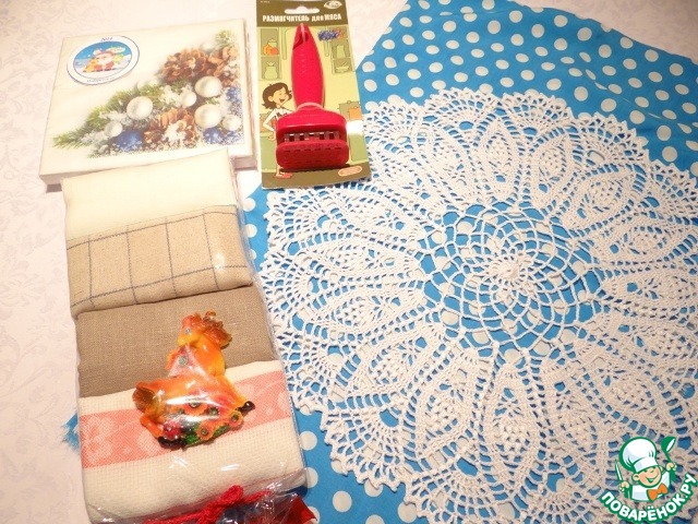 Замечательная кружевная салфетка- как я хотела такую! Новогодние салфетки, размягчитель для мяса - у меня такого нет, магнитик - лошадка и... восхитительный комплект льняных полотенец - это вообще моя мечта!