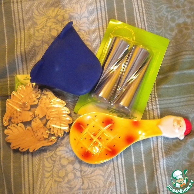 А теперь поподробнее. Тут всякие кухонные штучки. Красивая и ароматная деревянная подставка (можжевельник?), силиконовая прихватка, подставка под ложку с дедом морозом на ручке (прикольная) и вот такие конусы - "набор форм для вафельных рожков" (девочки, подскажите варианты использования).