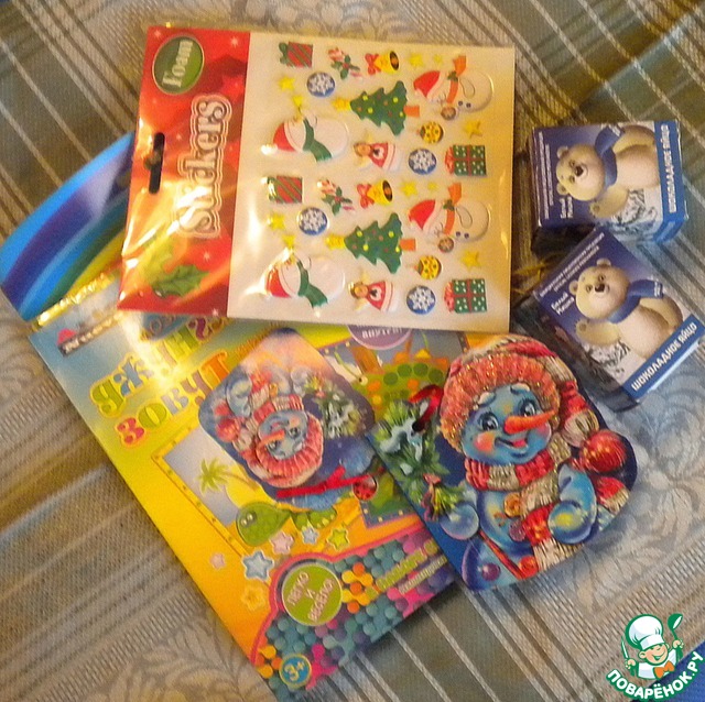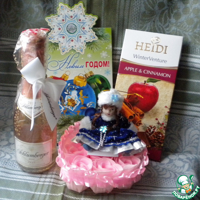 за здоровье Наташеньки), шоколадка с яблоком и корицей, мыльные розочки и симпатичная фарфоровая куколка-Снегурка. И,конечно, открытка с очень теплыми пожеланиями он Наташи.
