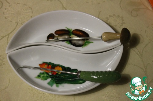 Восхитительные тарелочки под закусочки. Боже мой!!! Я никогда такой красоты не видела. И вилочки с наконечниками грибочком и огурчиком.