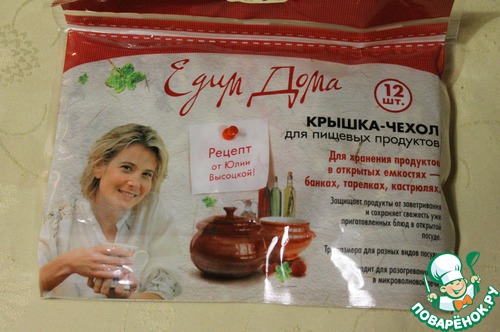 а еще вот такие полиэтиленовые крышечки для хранения продуктов в открытой таре. очень удобно накрыть мисочки и убрать в холодильник, а на обратной стороне рецептик от Юлии Высоцкой