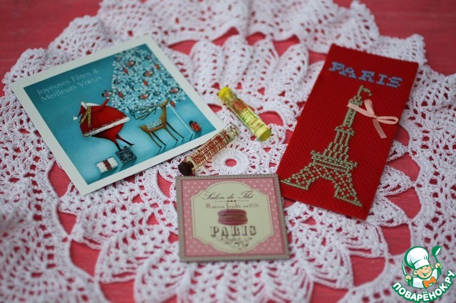 Конечно открытка с милыми пожеланиями, а еще ароматы для выпечки, очень красивый магнит с Парижа, так как я там была и не раз, он будет очень к стати. Так как мой разбился, и в моей коллекции очень его не хватало!