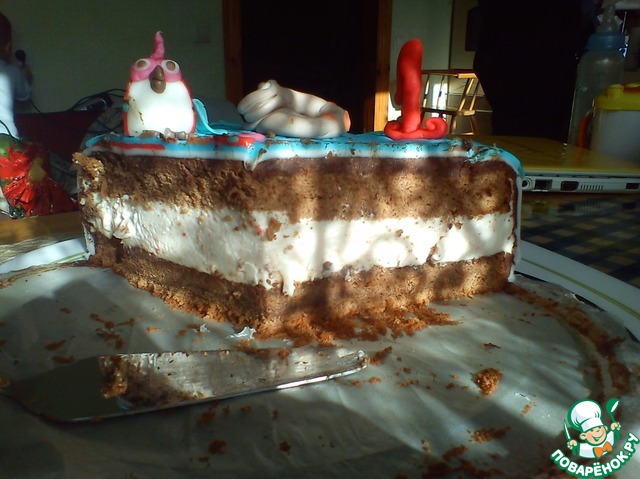 внутри был шифоновый шоколадный бисквит по рецепту lenkotova https://www.povarenok.ru/recipes/show/56294 и хочу сказать что с тех пор я влюблена в этот бисквит!!!он получается очень сочным и нежным, просто тает во рту!!!