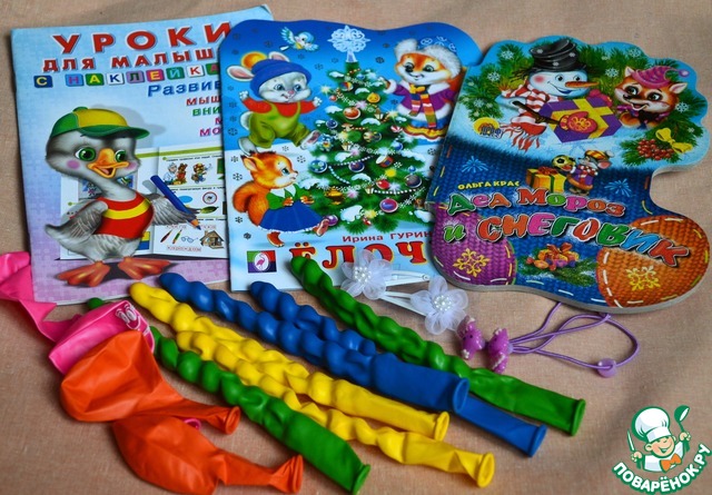 Подарки для деток: яркие разноцветные шарики, книжки для сыночка, заколки и резинки для доченьки.