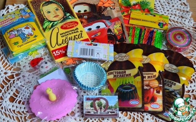 Листовой желатин, смесь для приготовления варенья и желе, шоколадная стружка. Замечательные розетки для выпечки, разноцветные барные аксесуары, и розовенькая силиконовая крышка (правда не знаю как ею пользоваться)