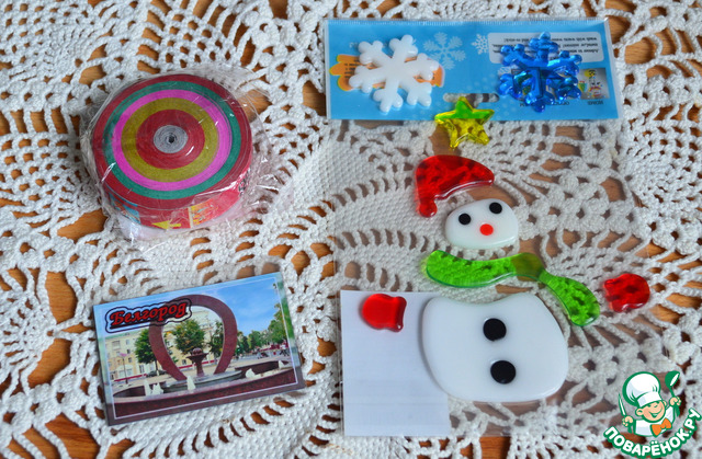 Снеговичок - наклейка на окно, новогодний серпантин (обязательно используем на Новый год) и магнитик с видом родного города Светочки.