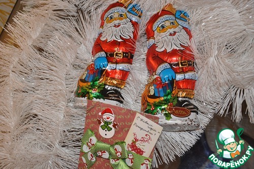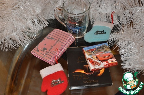 Шоколад,хорошенькая варежка и сапожок. Кружка для сына с машиной. И розовый кошелечек для дочки. были еще бенгальские огни...но не уберегла я их до фотографии...дети устроили праздник во всех его проявлениях)))