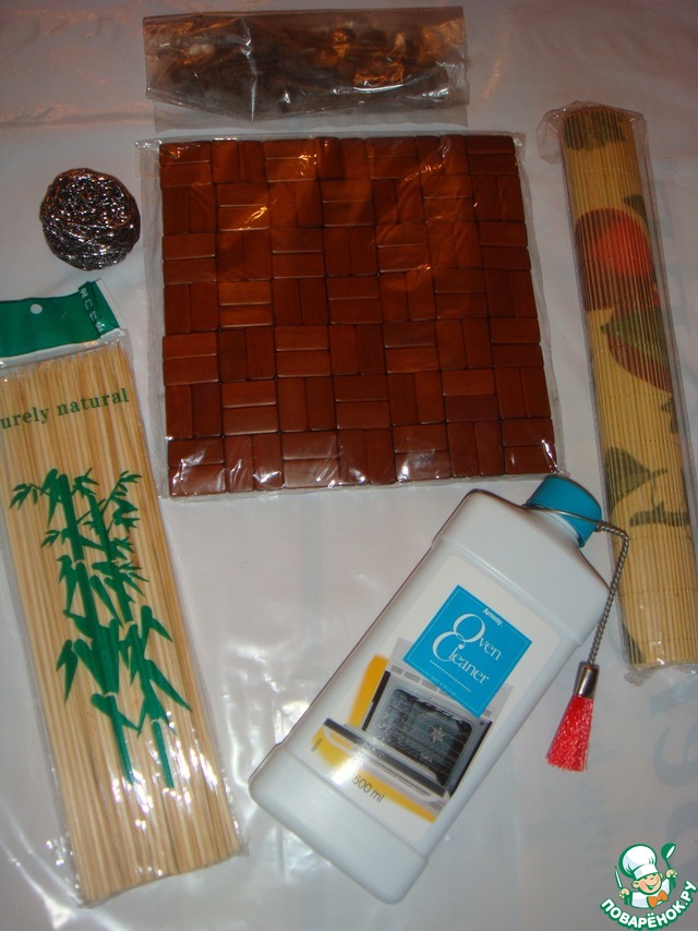До того милые цветочки будут теперь и меня радовать своей красотой и нежностью!Металлическая губочка - такая удобная,мягенькая,не царапает поверхность и не колет руки!Очень нужная и такая стильная подставка под горячее!Деревянные шпажки использую очень часто,готовлю на сковороде шашлычки и фруктовые,и мясные .У меня как раз заканчивается пакетик...Бамбуковую салфеточку с нежнейшим рисуночком я уже использовала.Очень приятные пастельные тона!Как мне нравится бытовая химия
