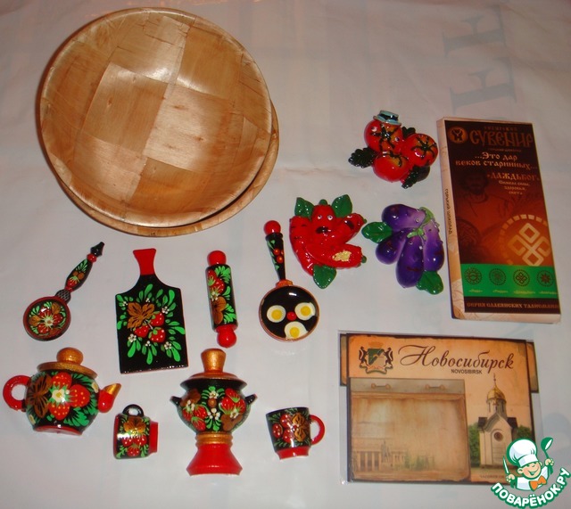Еще одна моя мечта сбылась!Деревянные салатники,такие милые!В них подам закуски на Новогодний стол!Ведь год будет синей деревянной лошади!С шоколадом Ренатушка снова отгадала!Очень люблю горький!Уже полакомилась!Это так вкусно!А сколько магнитиков и все до того интересные!Очень красивый с изображением Новосибирска! А помидорчики,перчики и баклажанчики такие "прикольные"!И целый набор из хохломы!Никогда таких не видела!У меня ь на кухне стало так весело!