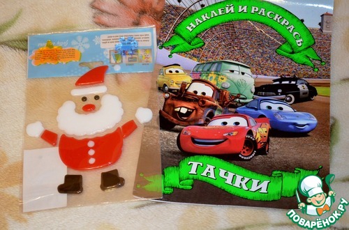 Это для Ванюшки! Отличные наклейки и раскраски и классный Дедушка Мороз, которого мы уже приклеили на зеркало. Теперь он улыбается нам и шлет от Светика привет!!!