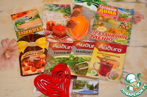Специи, подставка для горячее, журнальчик с рецептами, магнитик с видами города Белгорода. А еще присоболение для сливания рассола при солении. Во как! Свет, у меня такого не было! Круто!!! И набор ложечек. Все уже в деле: как раз хватило для разных видов муки: пшеничной, цельнозерновой, ржаной, гречневой.