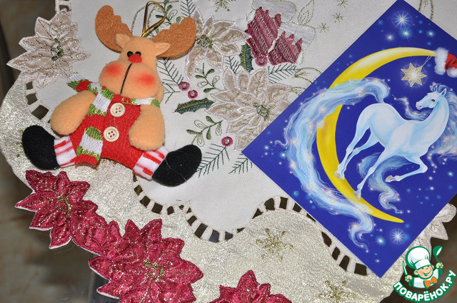 Красивенная овальная салфетка. она поработала фоном для фотографий) Потешный и славный олень)и открыточка с чудесными пожеланиями мне и моей семье!