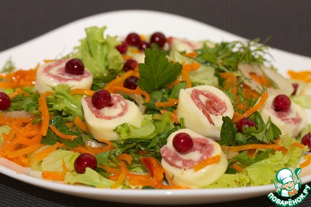 "Салатный микс с рулетиками из салями с сыром" https://www.povarenok.ru/recipes/show/74586/