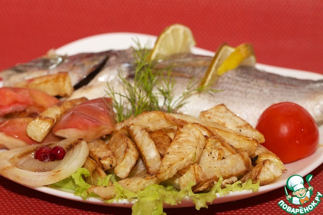 "Рыба запеченная с луком-пореем и яблоками" https://www.povarenok.ru/recipes/show/78471/