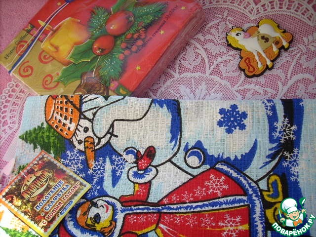 Новогодние салфетки украсят мой праздничный стол, полотенчик-салфетка создаст новогоднее настроение, магнит с лошадкой и долларами уже на холодильнике.