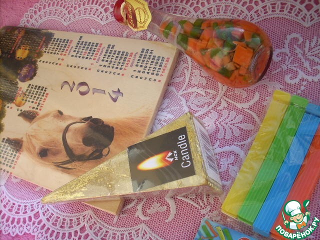 Очень красивая деревянная досточка с лошадкой и календарем. декоративная бутылочка украсили мою кухню. Очень нужные в хозяйстве зажимы для пакетов и золотая свеча-пирамида с приятным ароматом (зажжем в новогоднюю ночь).