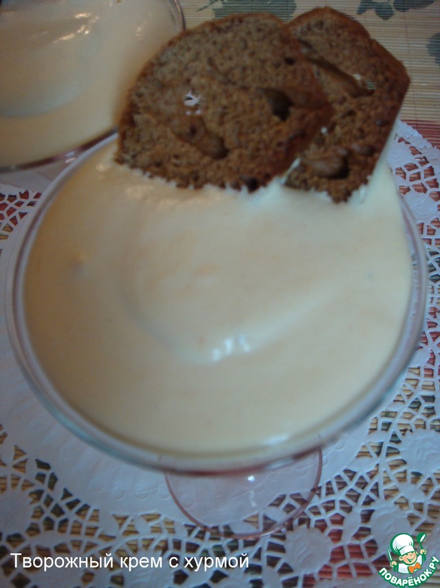 Творожный крем с хурмой по рецепту Ниночки Nika - очень нежный и вкусный,шелковистой структуры,сервирован по совету Любаши ломтиками Теплых имбирных кексов.