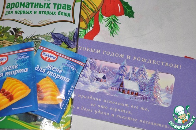 такой открыточки у меня еще не было,поэтому не удержалась и решила показать. Смутил увесистый пакет. А в нем была открыточка с чудесными пожеланиями и приятное дополнение. Желе для торта и огромный пакет смеси ароматных трав!
