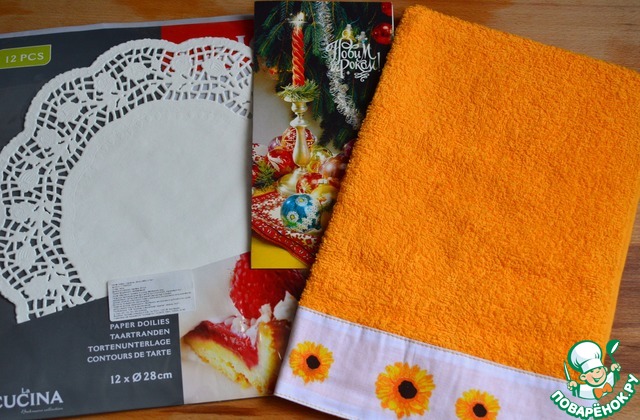 Когда началась новогодняя акция мы на форуме делились, кто бы что хотел получить в подарок, и многие писали об ажурных бумажных салфетках, которые не везде продаются. Вот Танюша решила сделать мне сюрприз и прислала такие вот красивые салфетки-подставочки для торта, замечательное и такое солнечное полотенечко. И конечно же, новогоднюю открыточку с теплыми и искренними пожеланиями.