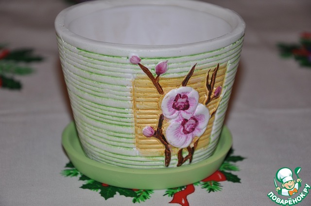 Вот такой хорошенький горшочек! такой нежный. Ленуся думала прислать его сразу с цветком) но все таки одумалась,и предоставила мне самой выбрать счастливца для этого симпатяги
