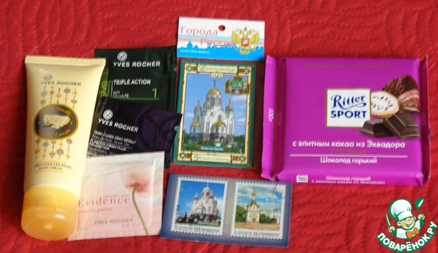 Крем для рук и пробнички от Ив Роше (моя любимая марка), красивые магнитики с видом Екатеринбурга и вкуснючая шоколадка с элитным какао из Эквадора!!!