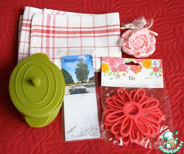 еще чудесная силиконовая формочка, красивые подставки под стаканы, магнитик с блокнотом с видом Элечкиного города, приятной расцветки кухонное полотенчико и очень красивое мыло в виде розы ручной работы (жалко его даже использовать, только любоваться)