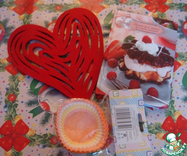 Подставочка под горячее в виде сердца,такая мягенькая и красивая,просто чудо!Мечта!Очень нарядные и любимые мной Формочки для кексов!Ну,а Книга для записи кулинарных рецептов - настолько удобная!В ней и интересные рецепты есть,и удобно свои записывать...Я просто в восторге!