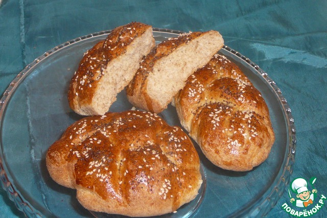 Рецепт хлебных булочек был на планшетке. Обычное дрожжевое тесто, разве что с добавлением цельнозерновой муки. Тесто вышло туговатое, я бы конечно добавила больше жидкости, но рецепт, есть рецепт. Готовила 1/2 порции, ровно на 3 булочки. Одну из них "заплела" как обычно, на двух других косичку "пропечатала". Получились вот такие красотули! Различия есть, но они не принципиальны. В будущем обязательно попробую так же оформить булочки из теста по другому рецепту.