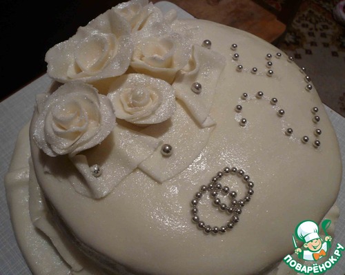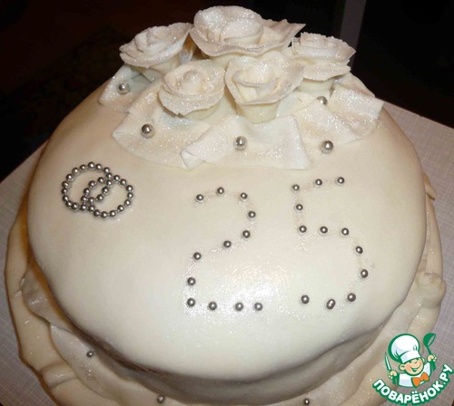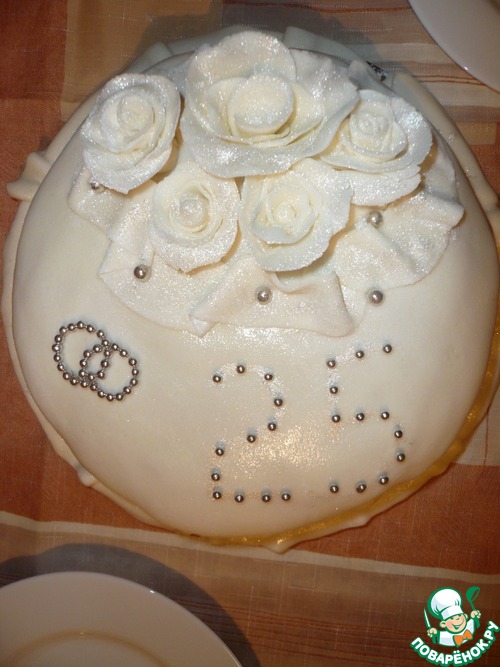 Этот тортик, я делала для родителей на серебряную свадьбу. Мой первый опыт работы с мастикой. Я думаю, у меня неплохо получилось для первого раза. Спасибо, Светочке -avani, за её советы по работе с мастикой.