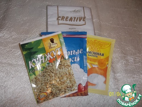 Салфеточки,кунжут,взбитые сливки и лимонная кислота.