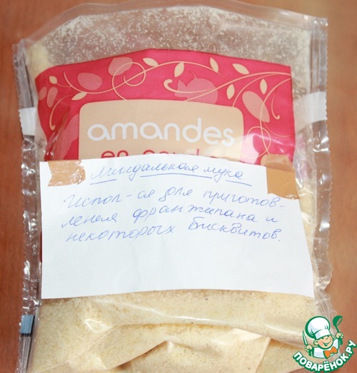 пакетик с миндальной мукой, к нему прикреплен листочек с переводом. Теперь я сама смогу делать марципановую массу. Анечка, ну это просто клад. У нас точно не продается такое