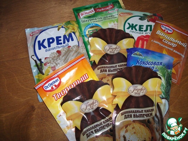 Среди них крем ванильный , смесь для творожного пирога , желе ,кокосовая стружка , ванильный сахар с натуральной ванилью и опаньки - сами шоколадные капли для выпечки