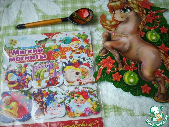 Набор новогодних магнитов, красивая открытка с теплыми поздравлениями и пожеланиями, маленькая симпатичная деревянная ложечка с росписью.