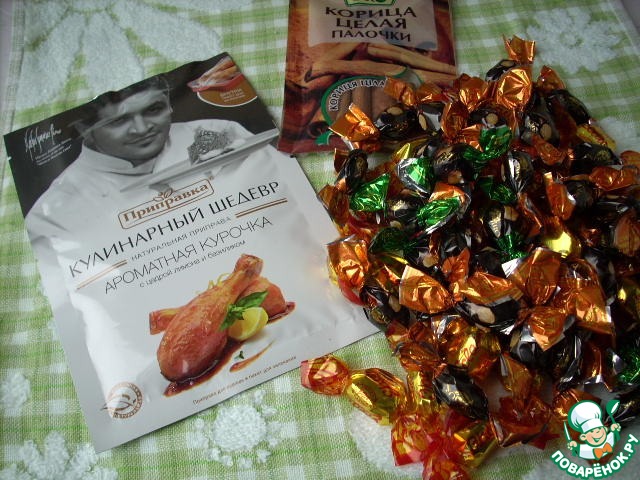 Приправа "Ароматная курочка" с пакетом для запекания, корица в палочках и целая россыпь,что удивительно, моих любимых конфет - миндаль и фундук в черном шоколаде!!!