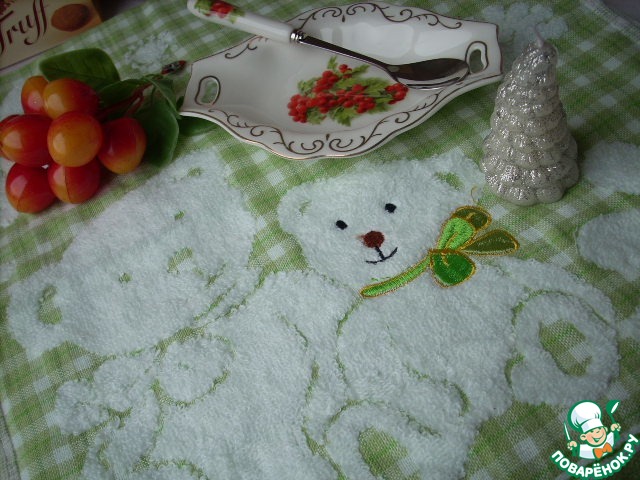 В посылочке прибыли - очень красивое, мягенькое полотенечко с мишками и ромашками, свечка-елочка, симпатичная маленькая тарелочка с ложечкой, черешенки для фото