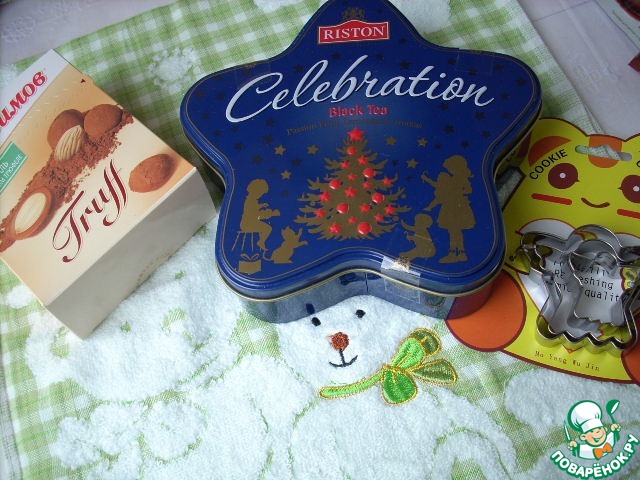 "Миндаль в молочном трюфеле", формочки для печенья "Ангел", шикарный черный чай "Торжество" - смесь цейлонского и китайского крупнолистового с ароматом маракуйи, лемонграсса и шоколада в очень красивой коробочке в форме звезды!!!