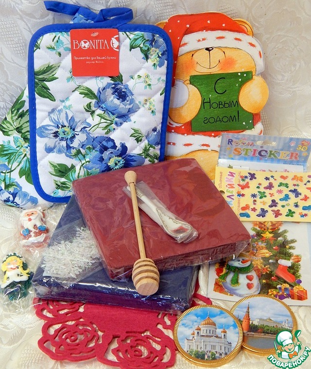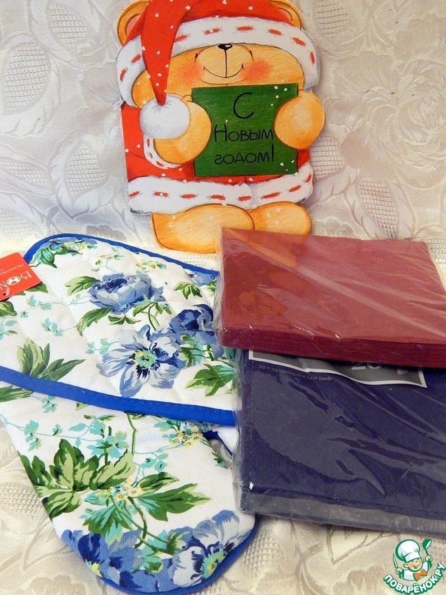 Салфетки, симпатичная новогодняя открытка с поздравлениями и набор кухонных прихваток.