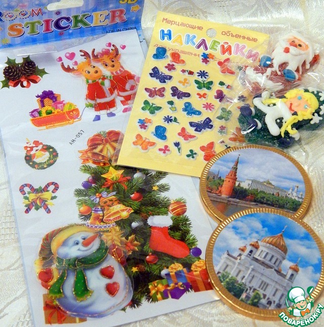 Не забыла Оля и про детишек, наклейки, мармелад в виде деда мороза и снегурочки, ну и шоколадные медали с видами.