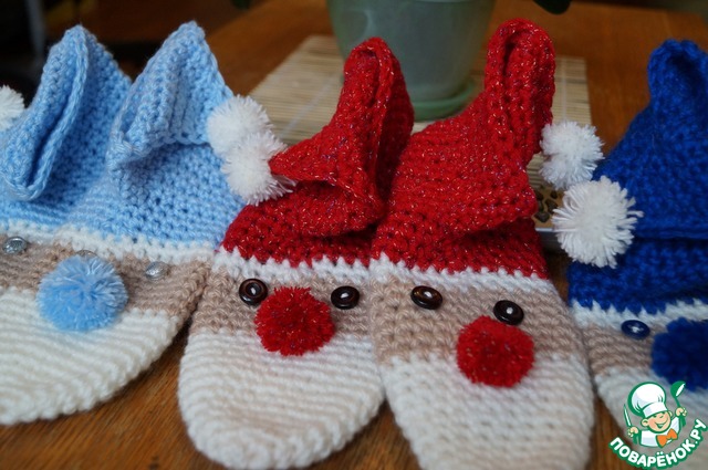 А такие тапочки-носочки в виде Санта Клауса получились всех возможных цветов и размеров) Санты разошлись по подругам и их деткам)
