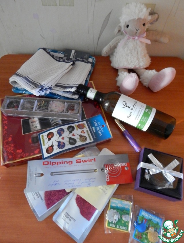 Подарочки-сувениры с надписями "Новая Зеландия" (на английском): магнитики, наклейки и овечка такая мягенькая - была сразу приХватизирована маленькой девочкой.
