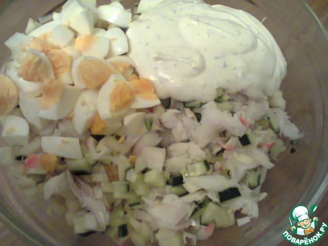 А сегодня ужинали салатом из трески горячего копчения. Копчёная рыбка ,несколько крабовых палочек ,свежий огурец , кисло-сладкое яблоко , репчатый лук и варёное яйцо.Заправка сметана 10%, немного горчицы , 0,5 ч.л. сахара и сушёный укроп и никакого майонеза!! Наша копчёная рыбка была довольно солёная , так ,что мы салат не солили. Приятного аппетита!!!!
