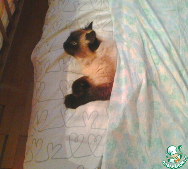Очень любит спать в Златеной кроватке, сколь его не гони от туда, всё равно прыгнет и ляжет к Злате.