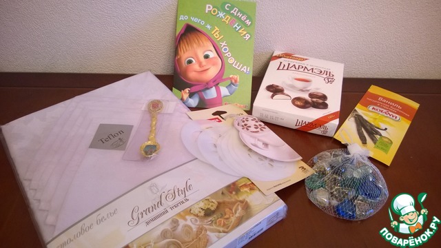 Обалденно красивое столовое белье в виде скатерти и салфеток, ложечка с видом Москвы, камешки с сердечками, трафареты для кофе, ваниль для тортиков и зефирчик в шоколаде и, конечно же, открытка с пожеланиями.