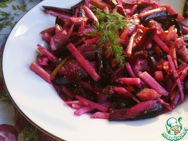 "Розовая стружка" https://www.povarenok.ru/recipes/show/55997/ Делала уже не раз, что-то мне нравится в этом салате, сочный, свежий!