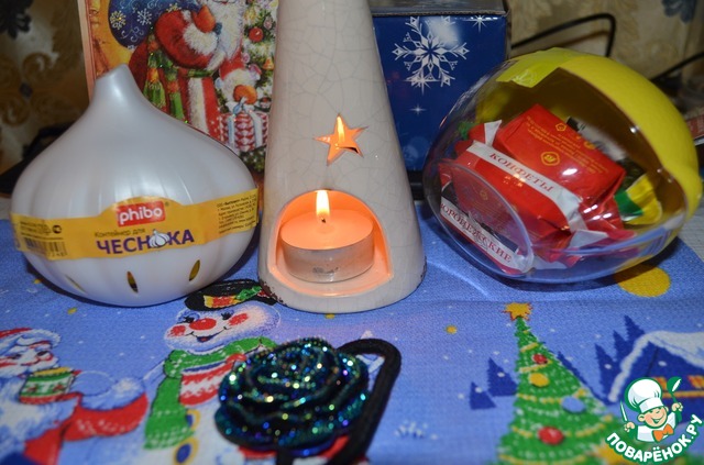Здесь и большое кухонное полотенце с новогодним принтом. Здесь и подсвечник из керамики,искусственно состаренный(а к нему Оленька приложила ароматические свечки..я бы никогда не вспомнила про свечи,если честно).Насте заколка в виде прекрасной синей розы и замечательная открытка с теплыми душевными поздравлениями