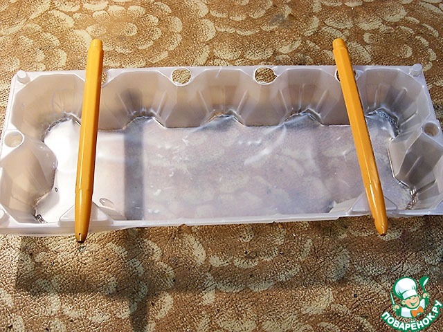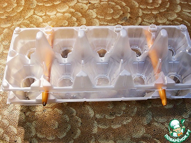 Берем теперь другую, фигурную, половину упаковки. Вырезаем ножом там, где раньше располагалось яйцо, круглую дырку размером с десятикопеечную монету. Эта дырка – для корней луковицы. Вырезаем 10 отверстий для 10 луковиц.